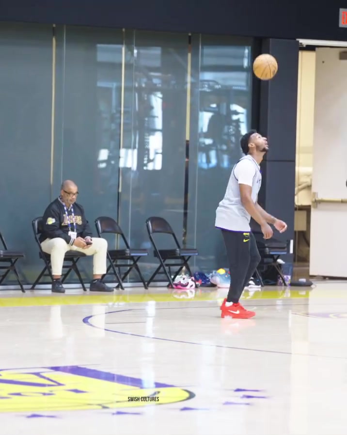脚法不错!湖人训练片段:布朗尼头顶脚踢篮球